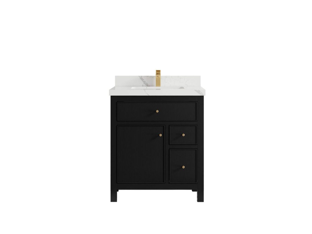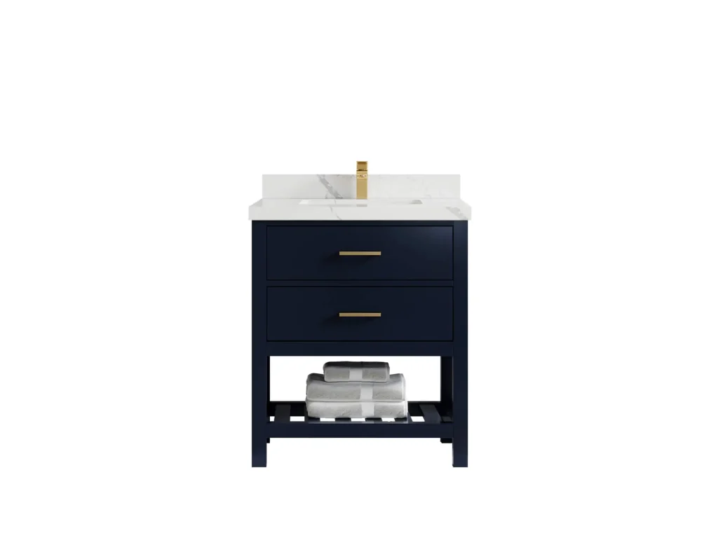 The Parker 30-Inch Bathroom Vanity offers a stylish, functional solution for any modern bathroom. Built with a solid wood frame and a white quartz countertop, it’s both durable and visually appealing. The open shelf at the bottom provides extra storage space for towels, toiletries, or decorative accents, helping to keep your bathroom organized while adding a touch of style.
